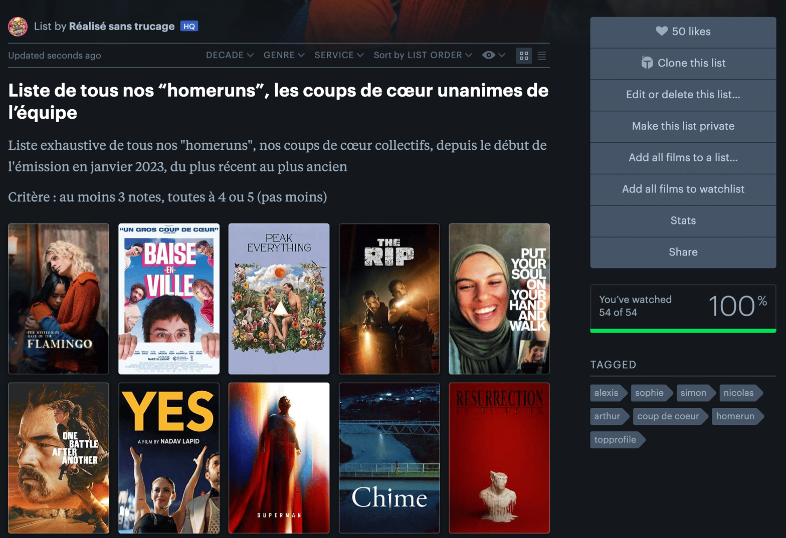 On n’en compte que 54 depuis le lancement de l’émission il y a à peine plus de 3 ans maintenant, des films qu’au moins 3 personnes ont vu et qui n’ont pas une note en dessous de 4/5. Le dernier, cela ne vous surprendra pas, est donc Le mystérieux regard du flamand rose, mais il y en a pour tous. Genre vraiment, ça va de Baise-en-ville à The Rip en passant par pas mal de films cannois.