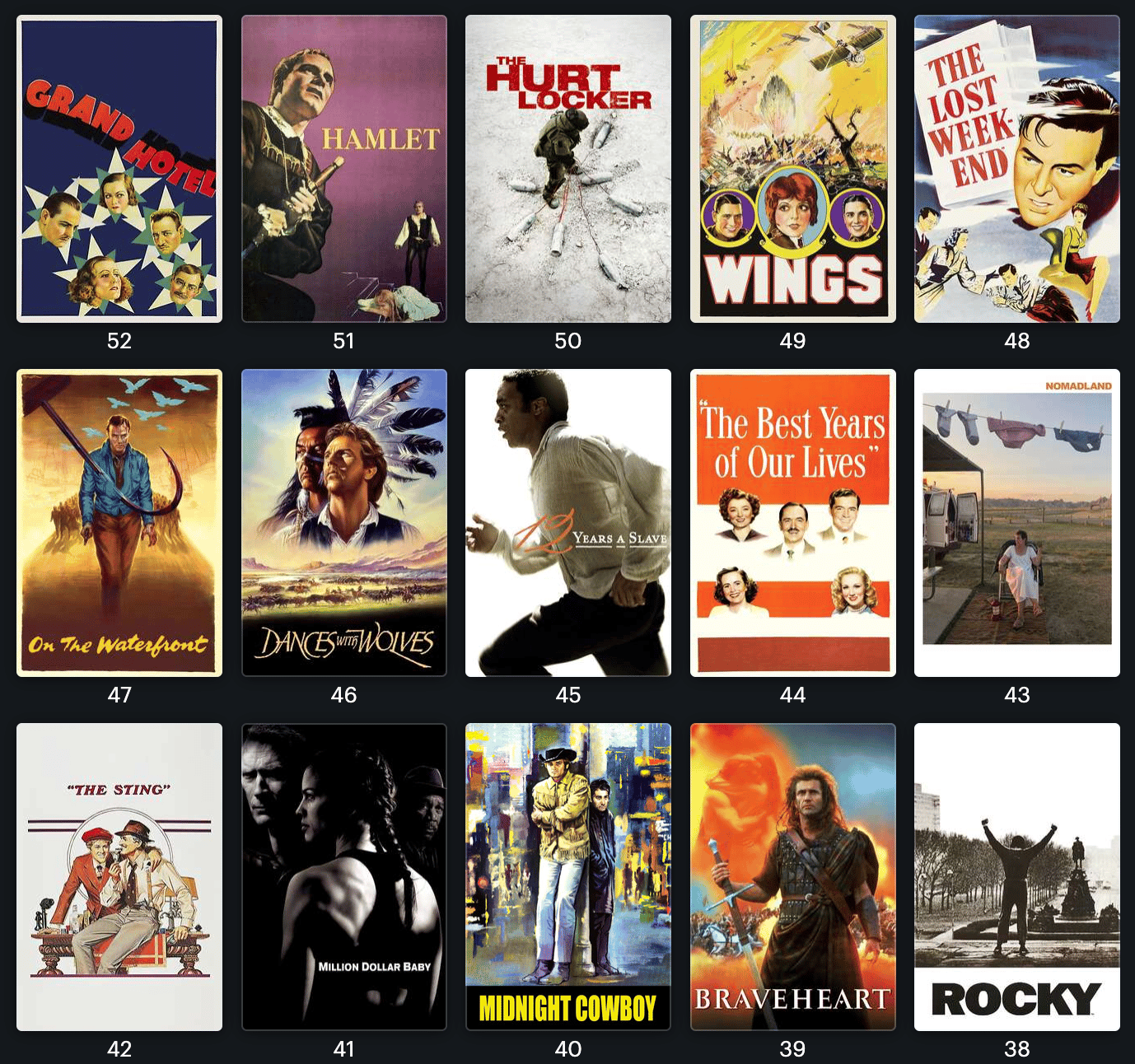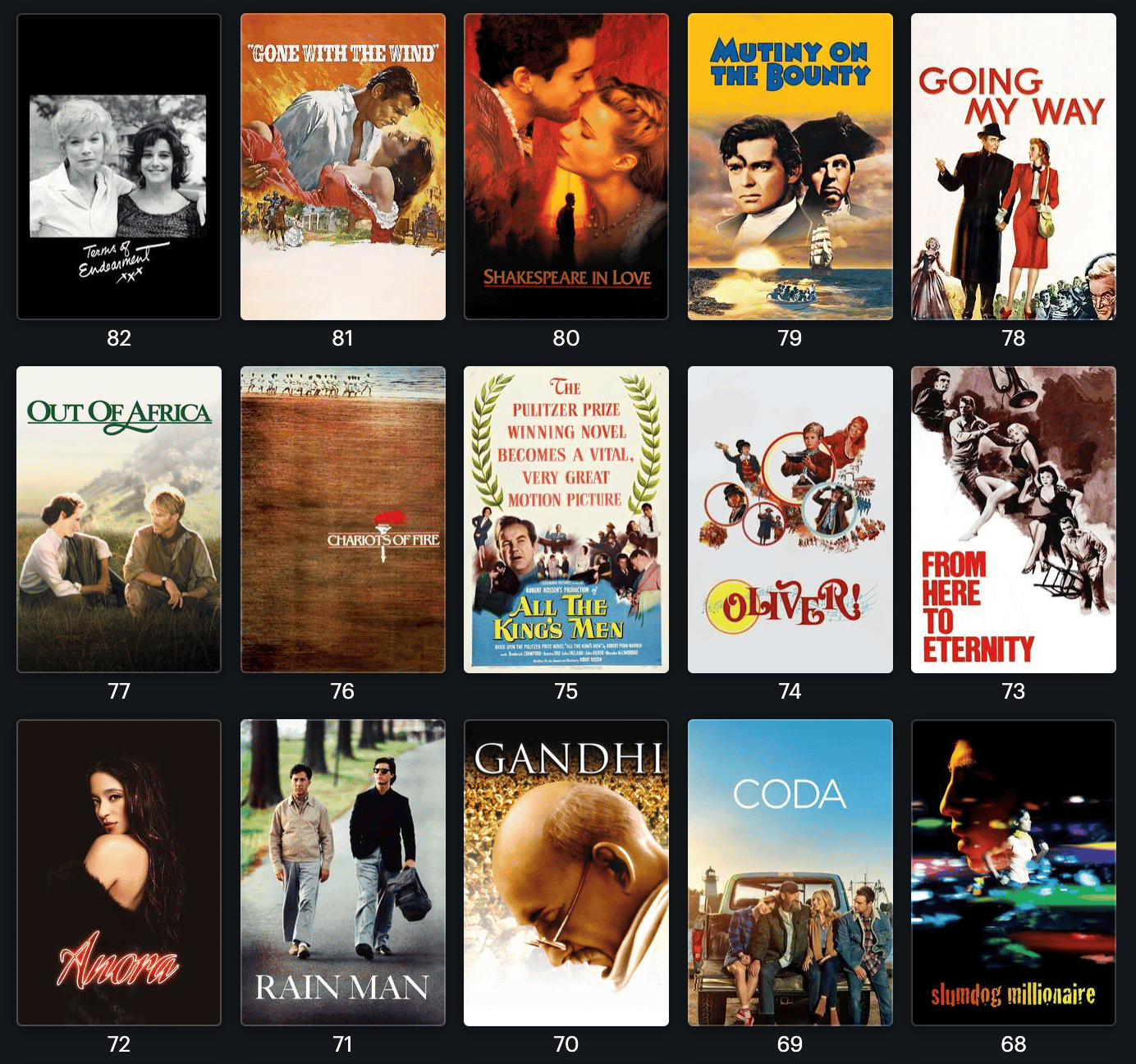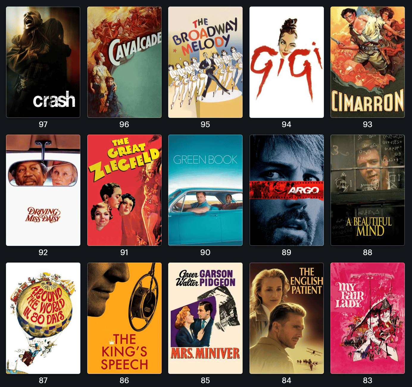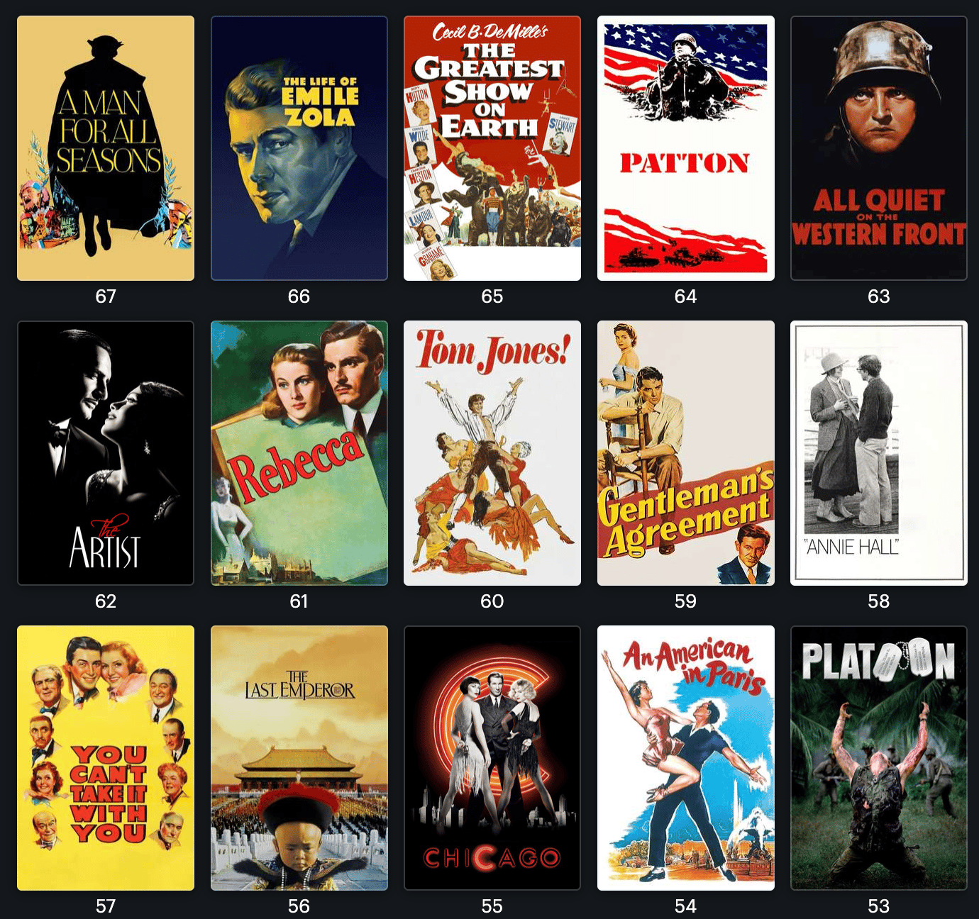 Vu que ce qui va suivre va être extrêmement long, je vais faire court en introduction. Depuis plusieurs mois, je (Arthur, je précise que j’écrirai à la première personne ici) me suis lancé dans un marathon comme je les adore : rattraper tous les Oscars du Meilleur film. Sur les 97 films récompensés, il m’en manquait 56. Après une centaine d’heures de visionnage, et beaucoup de réflexion, voilà le classement, du moins bon au meilleur. Vous n’allez sûrement pas être d’accord, c’est le principe.