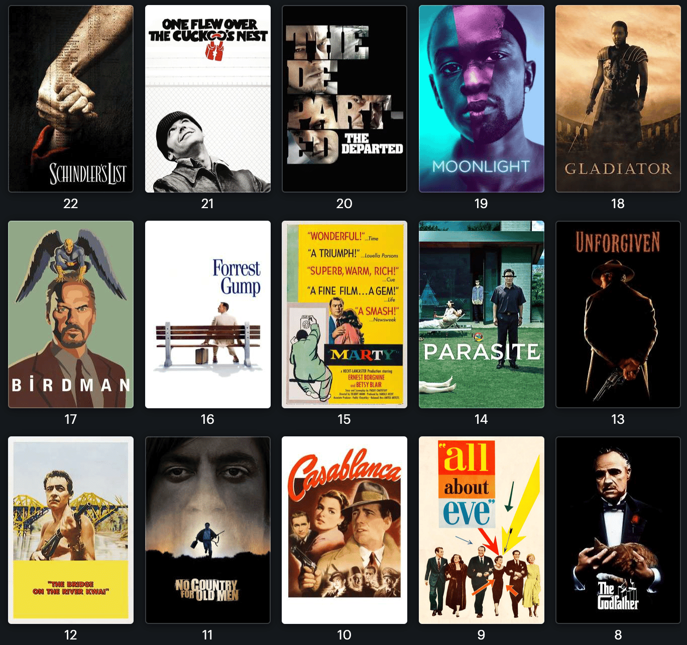 #14. Parasite, de Bong Joon-ho — Oscar de 2020 : on peut encore questionner la place des Oscars à travers le monde. Comme cette liste l’a prouvé, 96 Oscars du Meilleur film sont revenus à des films financés par des fonds américains. Pourquoi récompenser la Palme d’or coréenne, en dehors de son excellence ? C’est un prix qui chamboule un peu la vision de la cérémonie, qui se veut plus internationale mais reste et demeure principalement états-unienne. Parasite est un cas unique, qui a changé la face des cérémonies, et qui mérite sa place.