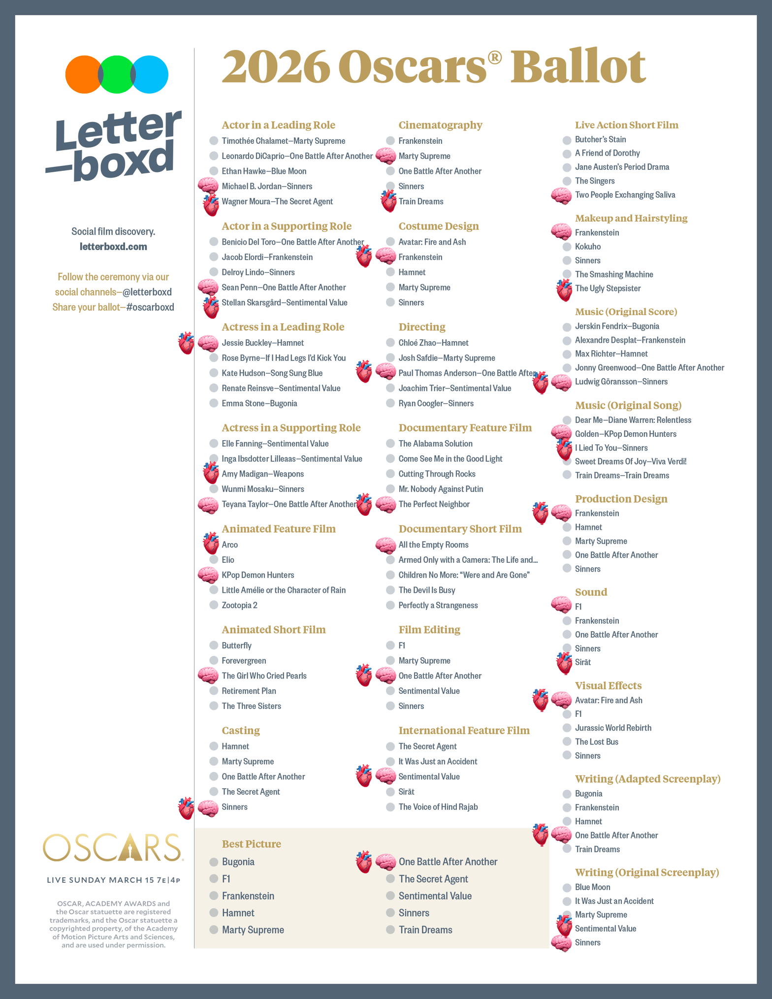 Bon, vu la longueur de cette newsletter, on va éviter d’écrire des tartines : Sophie et Arthur se sont prêtés au jeu des pronos des Oscars, en se basant sur le document fourni par Letterboxd. Emoji cœur, prono de cœur ; émoji cerveau, prono de raison. On verra à quel point ils se plantent, vu qu’il est fort difficile de bien tout prévoir cette année — poke la newsletter de la semaine dernière !